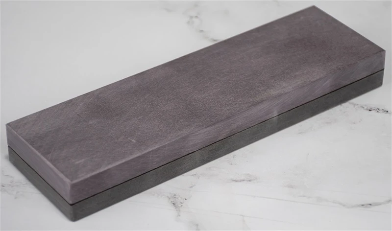 The Belgian Blue Whetstone, or BBW for short, has a blueish-purple color caused by the presence of iron in the stone. They are known for being of very uniform quality and working quickly. BBW’s are compared to water stones of 4000-6000 grit and are used to refine the edge after initial sharpening with the Pyrenees.