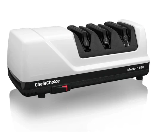 Named the Best 15/20 – Degree Hybrid Knife Sharpener by Cook’s Illustrated Magazine, the Chef’s Choice 1520 AngleSelect Knife Sharpener is designed to sharpen Asian, European and American style knives. Unlike other electric sharpeners, it can sharpen the 15 degree angles on your Asian style knives and the more traditional 20 degree angles on your European and American style knives. This sharpener eliminates the need for multiple sharpening gadgets, and provides a compact appliance that is fast and effective. The knife guides automatically position the knife at the proper angle for ease of use. The multi-stage Model 1520 features 100% diamond abrasives and patented flexible stropping/polishing discs that create an sharp and durable edge. It will quickly and easily sharpen virtually all quality cutlery including American, European or Asian style household knives; fine edge or serrated blades; Santoku and traditional Japanese style single bevel edges including the thicker Deba style blades; as well as sports knives and pocket knives.