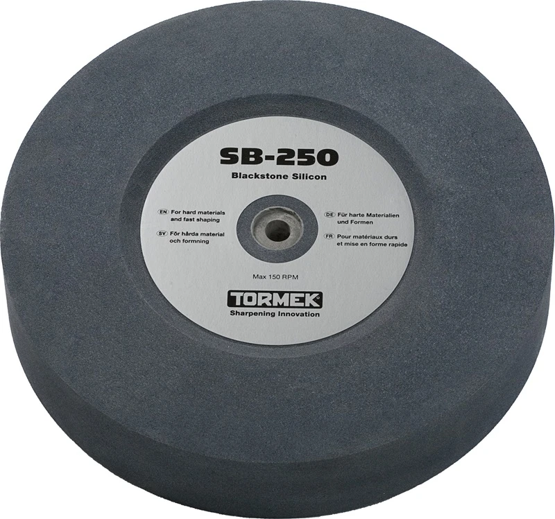 The Tormek SB-250 Blackstone Silicon has been developed for shaping and sharpening HSS and exotic alloyed steels. It can also touch up tungsten carbide. It does not offer faster steel removal on ordinary carbon steel. The combination of abrasive hardness, shape and grain size is optimized to work efficiently at the Tormek system’s low RPM. Its faster material removal is an advantage especially when shaping tools with a large bevel surface, where the grinding pressure is limited, for example, planer blades and woodturning skews. This Grindstone measures 10″ in diameter and 2″ wide. For metric folks, that is 250MM x 50MM.