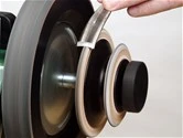 The two standard discs have a radius of 3 mm (1/8″) and a 60 degree tip. The set of optional narrow discs have a radius of 2 mm (3/32″) and a 45º tip. These smaller disc profiles permit the honing of small carving tools with very narrow profiles. The diameter of the larger wheel has been increased from 100 mm (4″) to 120 mm (4¾”), which speeds up the honing process.